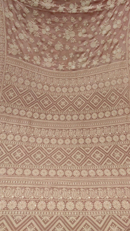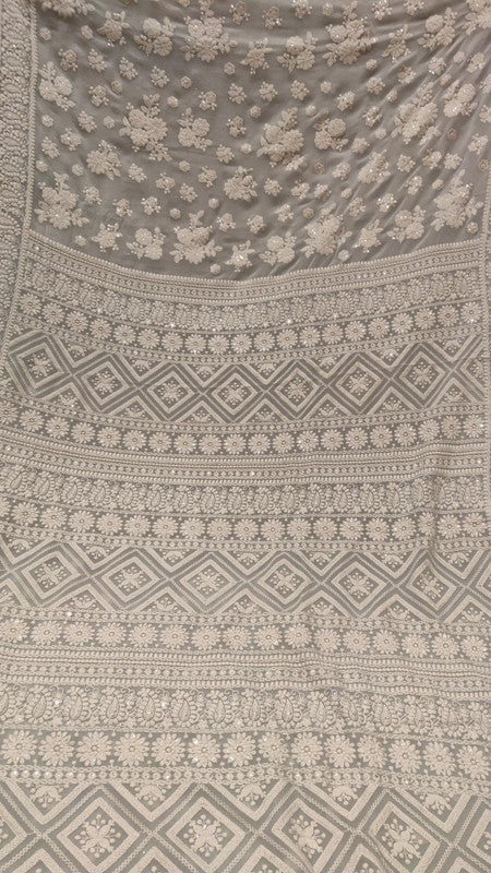 This pure georgette chikankari saree is a must-have for every fashion-forward woman. Its delicate fabric and intricate embroidery make it a truly exclusive piece.