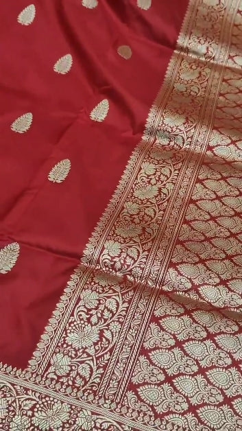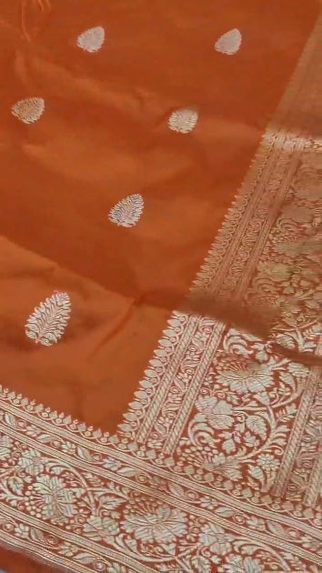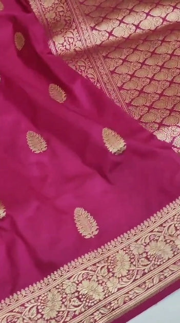 Step into timeless elegance with our Exclusive Pure Banarasi Katan Silk Saree, a masterpiece of heritage weaving and modern grace. Skilled artisans craft it. This saree comes with Sona Roopa Meenakari (Golden & Silver accents) and is woven with Kadhua work. Its feather-light drape offers unmatched comfort, making it perfect for weddings, festive occasions, or heirloom gifting. This saree is certified with the Silk Mark.