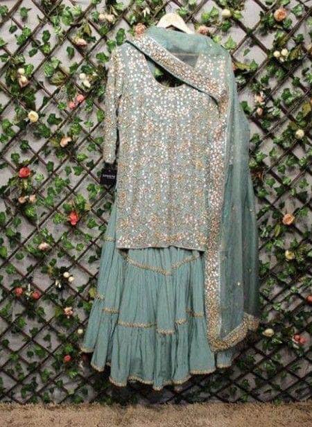 Fashion Vibes provides Georgette Kurti with hand embroidered silver gota work Sharara and matching dupatta with four sided lace.