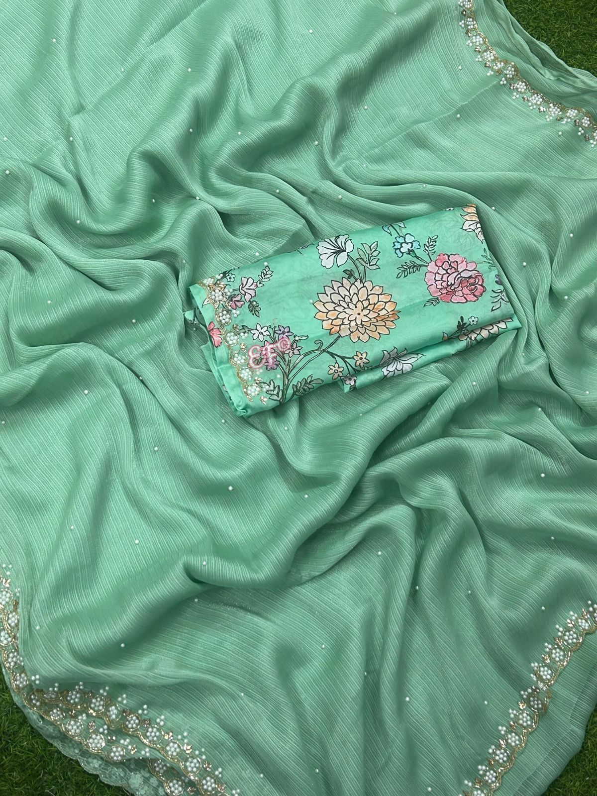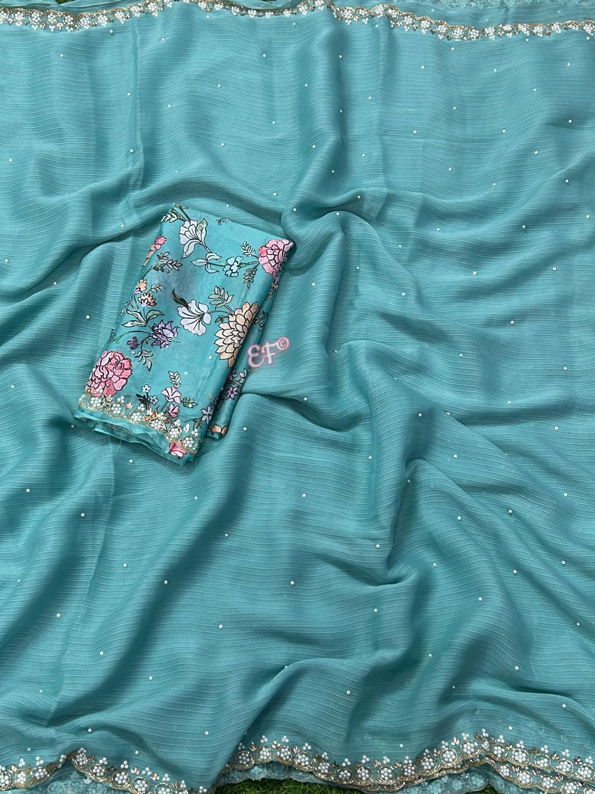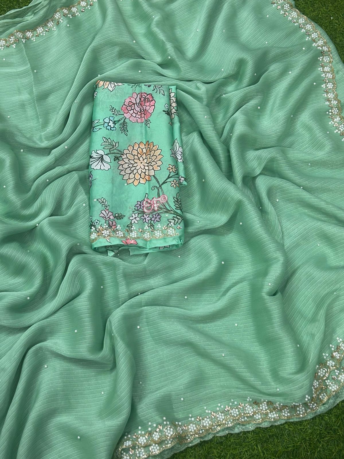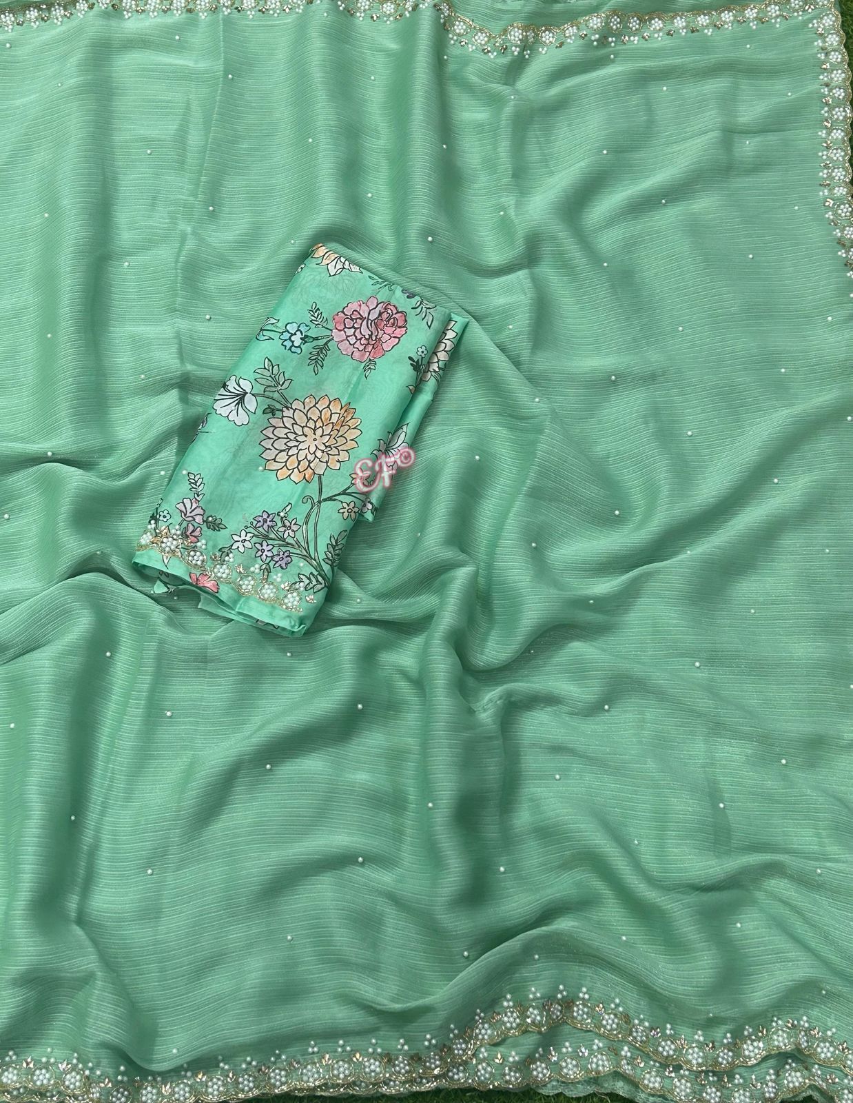 The Cocktail Party Collection features luxuriously soft Georgette Silk Saree gracefully adorned with delicate pearls. Each saree is crafted with intricate Hand Maggam Cut Work Borders. This saree comes with elegant Running Work and Printed Work Blouse pairings.