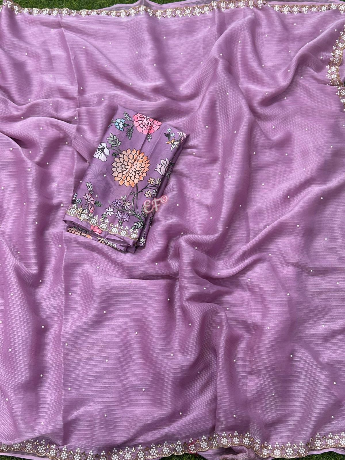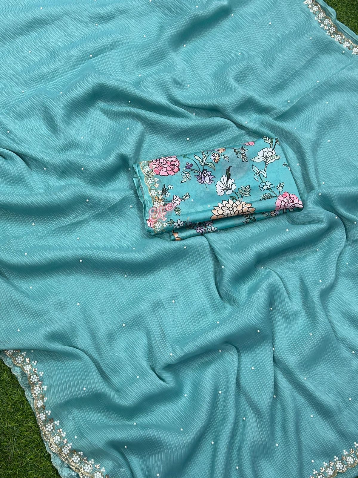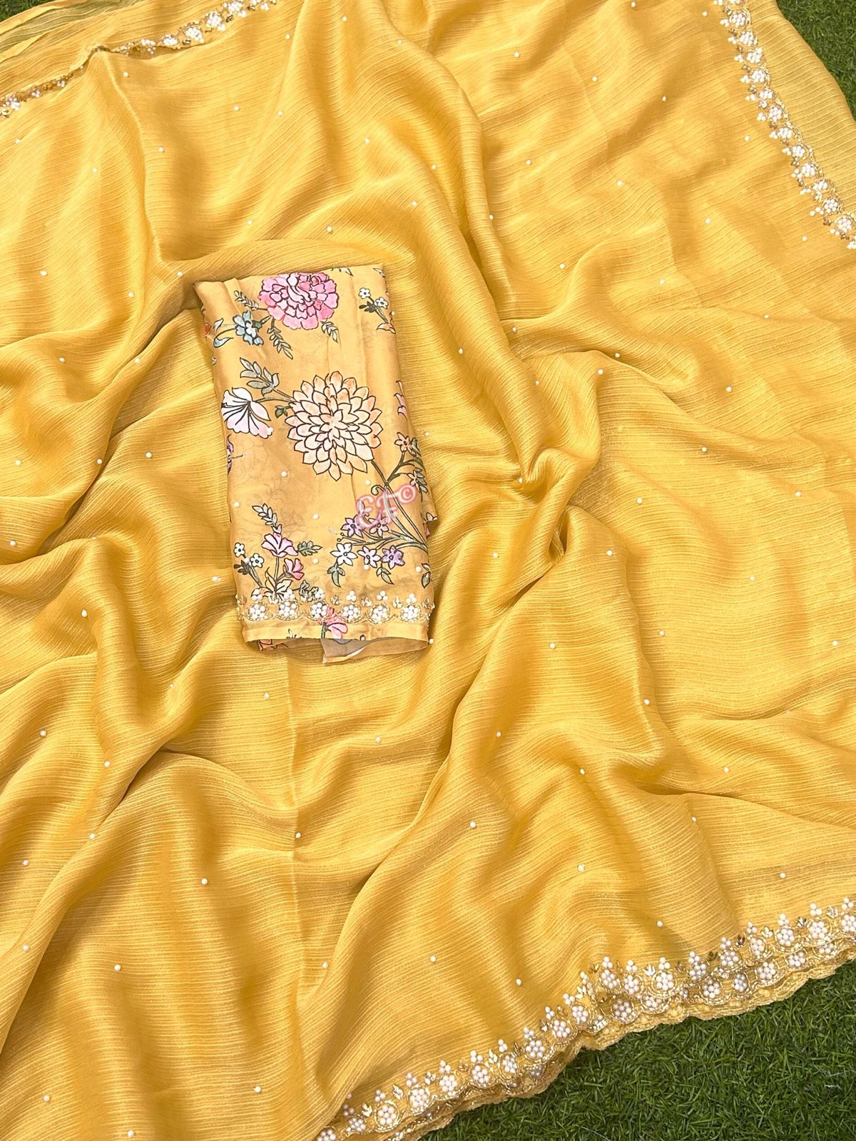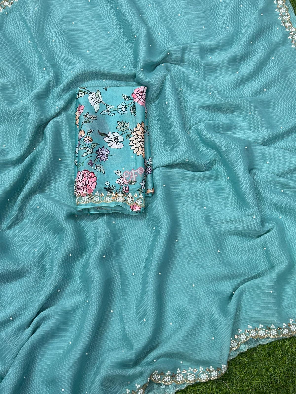 The Cocktail Party Collection features luxuriously soft Georgette Silk Saree gracefully adorned with delicate pearls. Each saree is crafted with intricate Hand Maggam Cut Work Borders. This saree comes with elegant Running Work and Printed Work Blouse pairings.