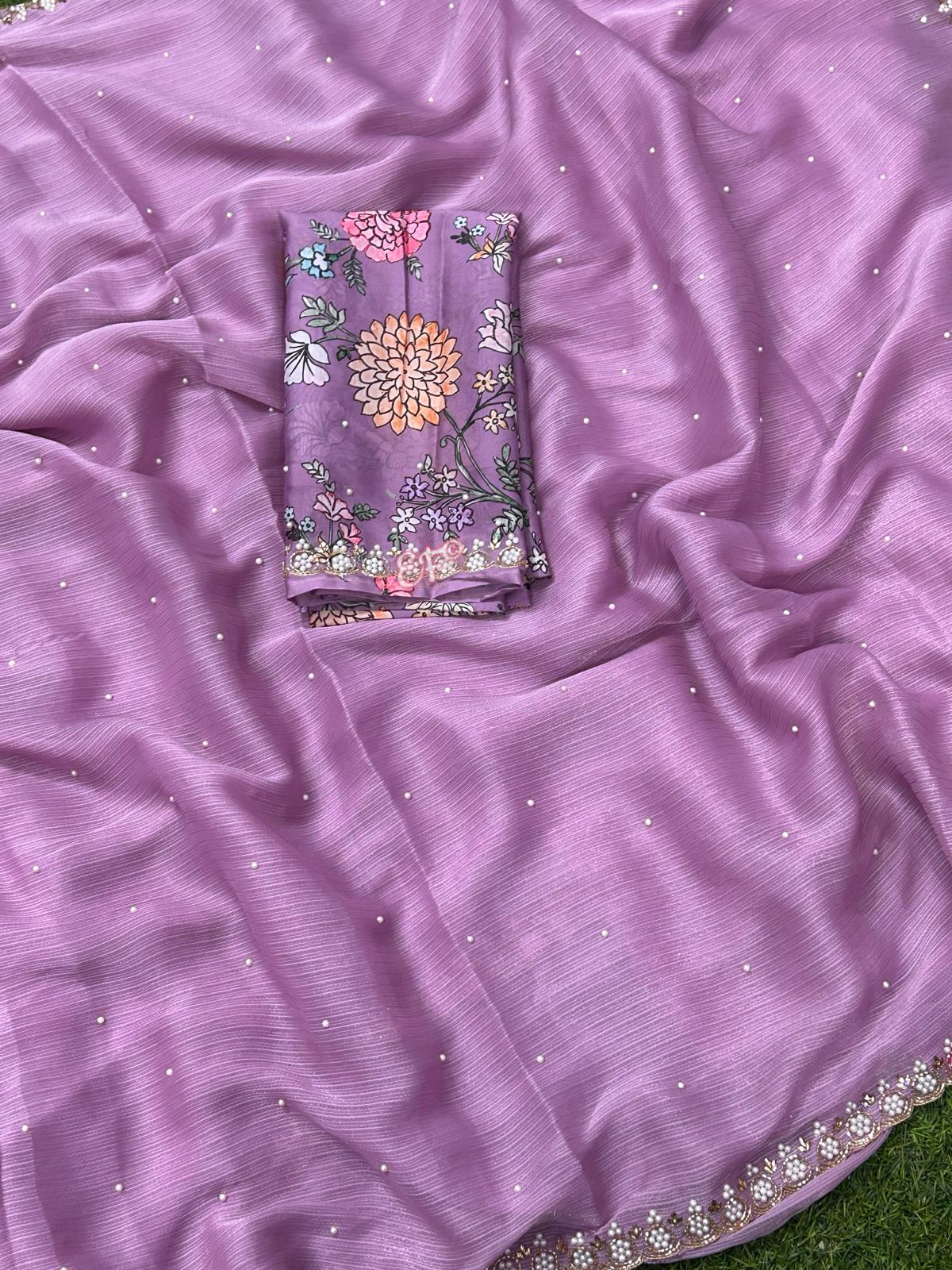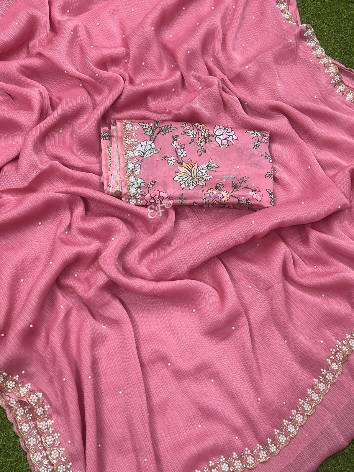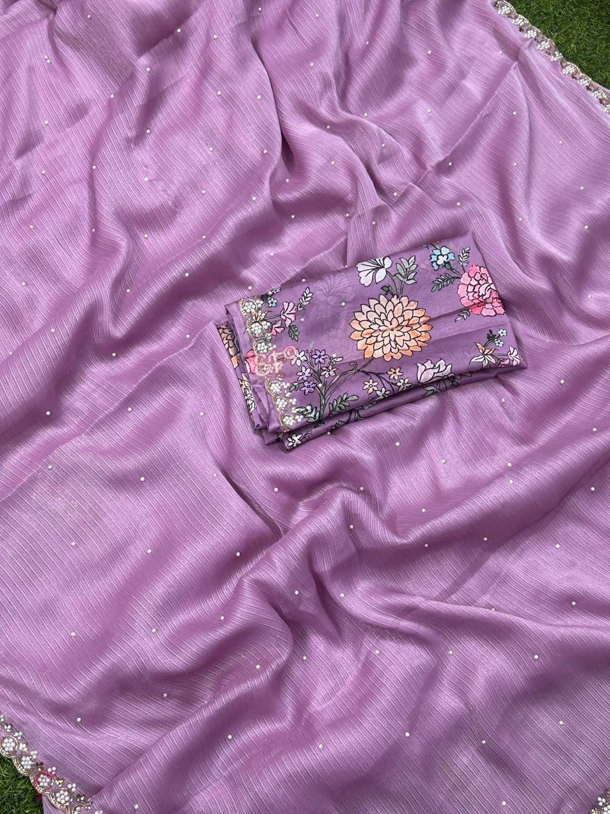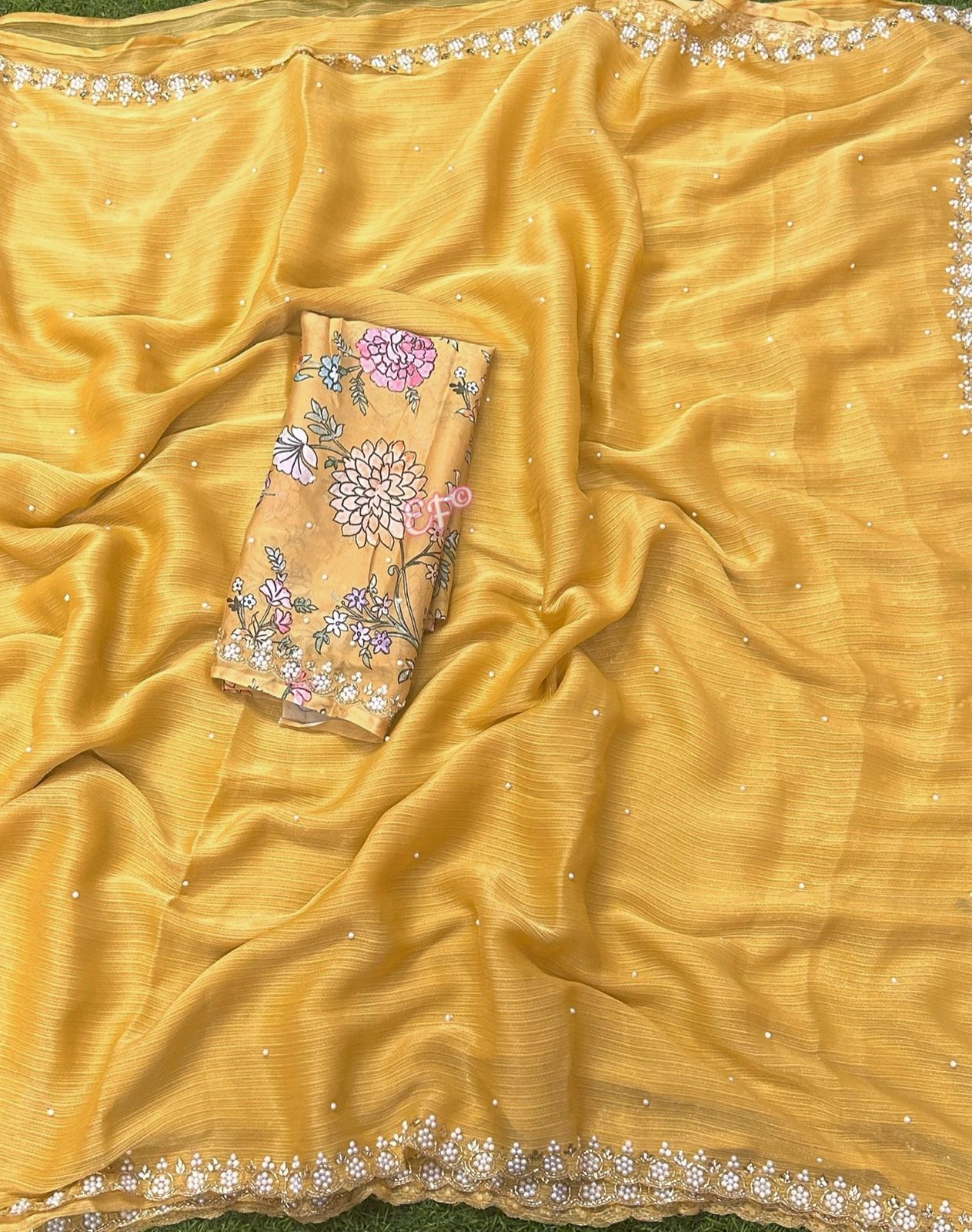 The Cocktail Party Collection features luxuriously soft Georgette Silk Saree gracefully adorned with delicate pearls. Each saree is crafted with intricate Hand Maggam Cut Work Borders. This saree comes with elegant Running Work and Printed Work Blouse pairings.