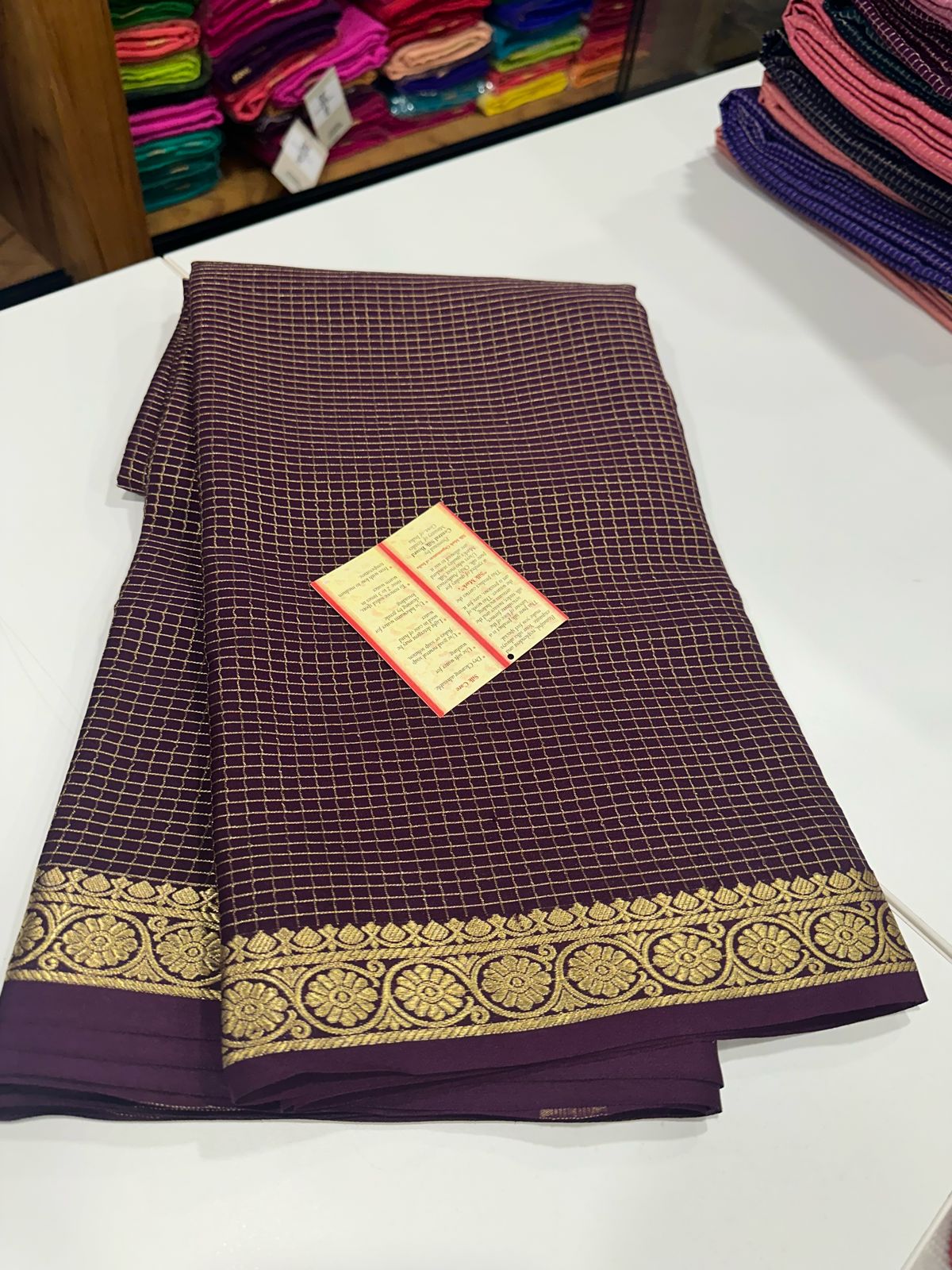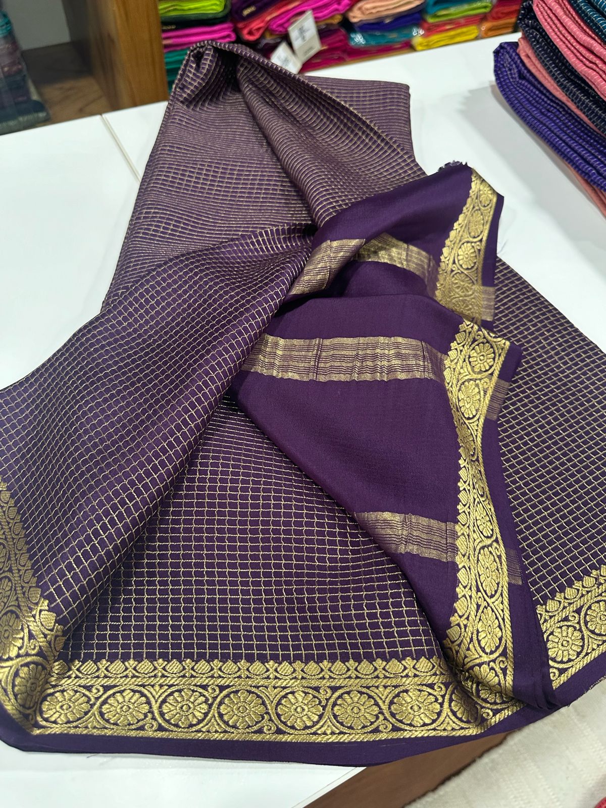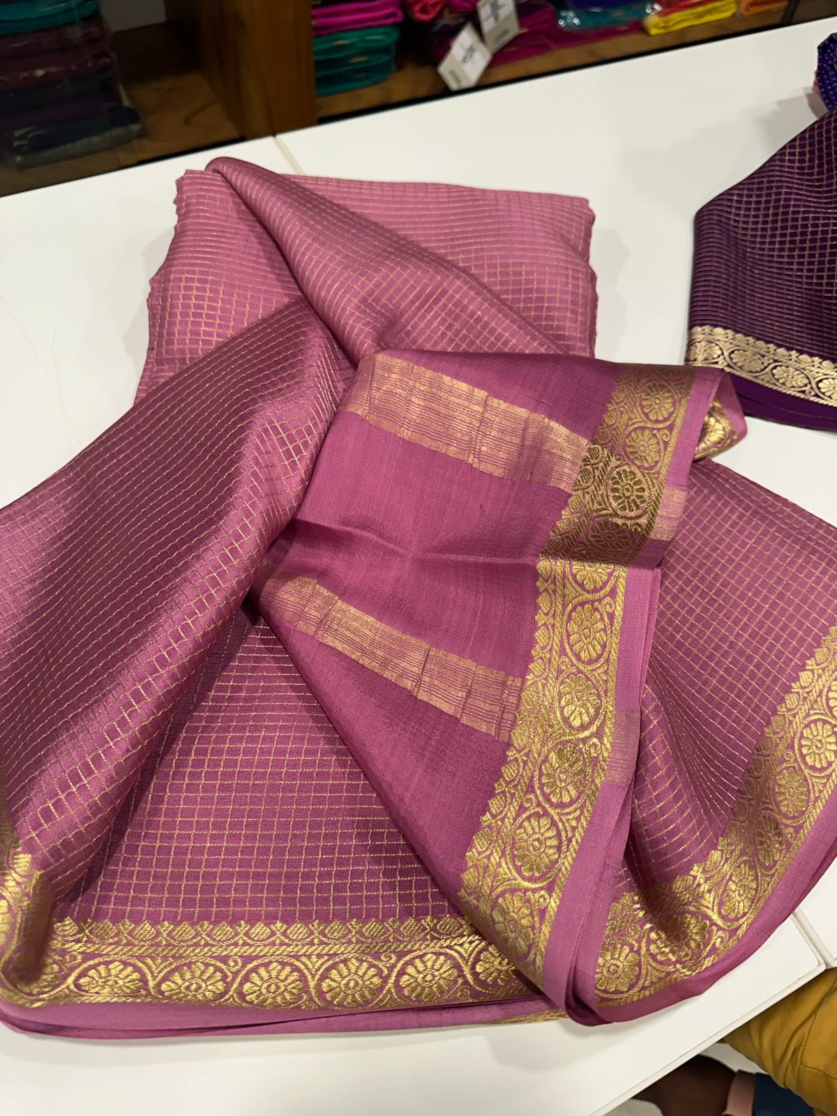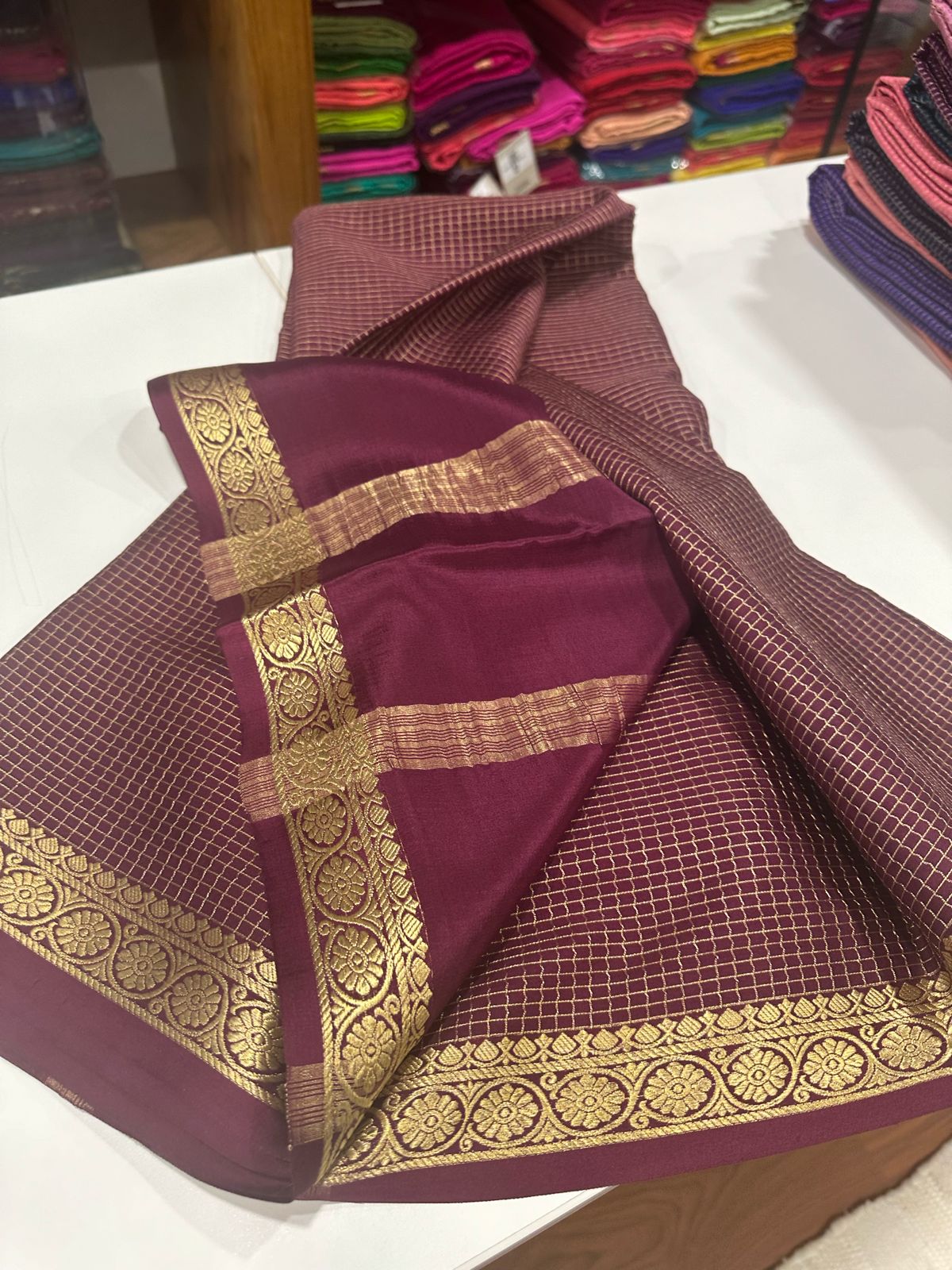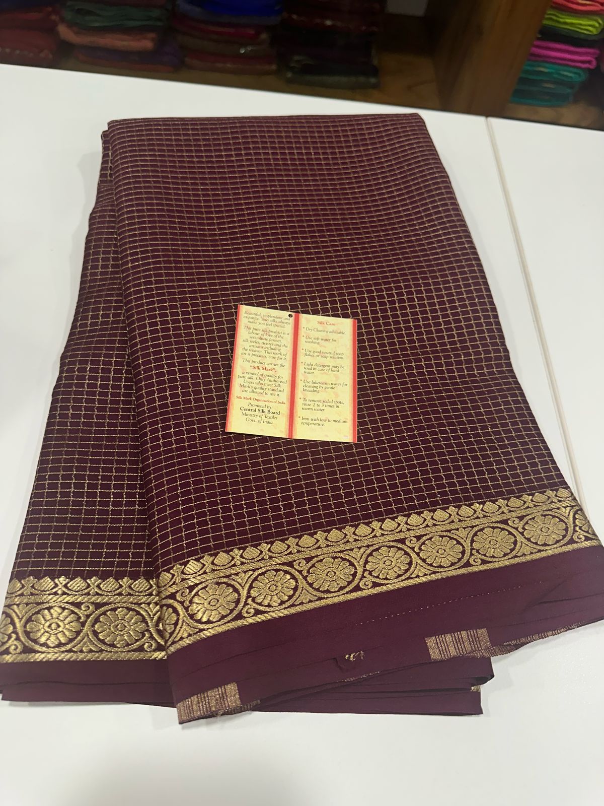 Experience sophistication with our Pure Mysore Silk Sarees adorned with delicate checks, now offered exclusively at Fashion Vibes. Crafted with fine-quality materials. Our latest designer collection features a range of captivating Pure Mysore Silk Sarees with Small Checks, ideal for adding a classic touch to any occasion.