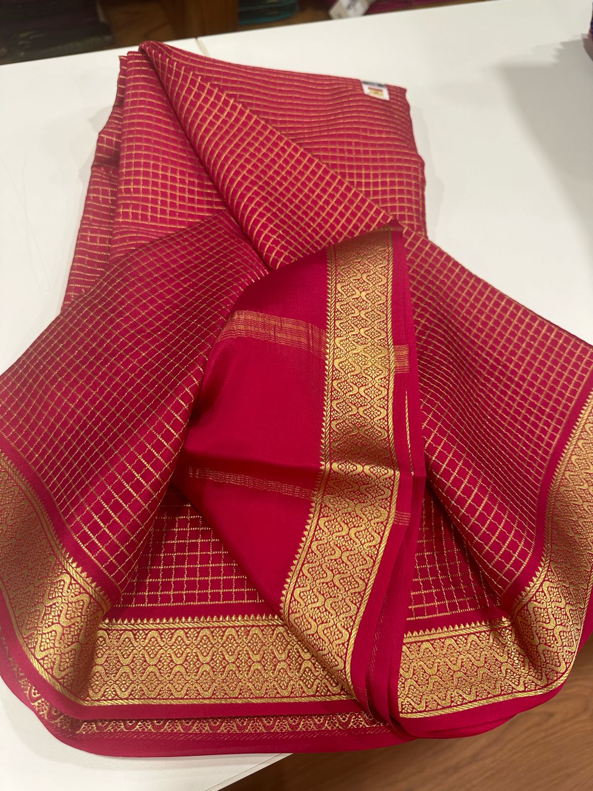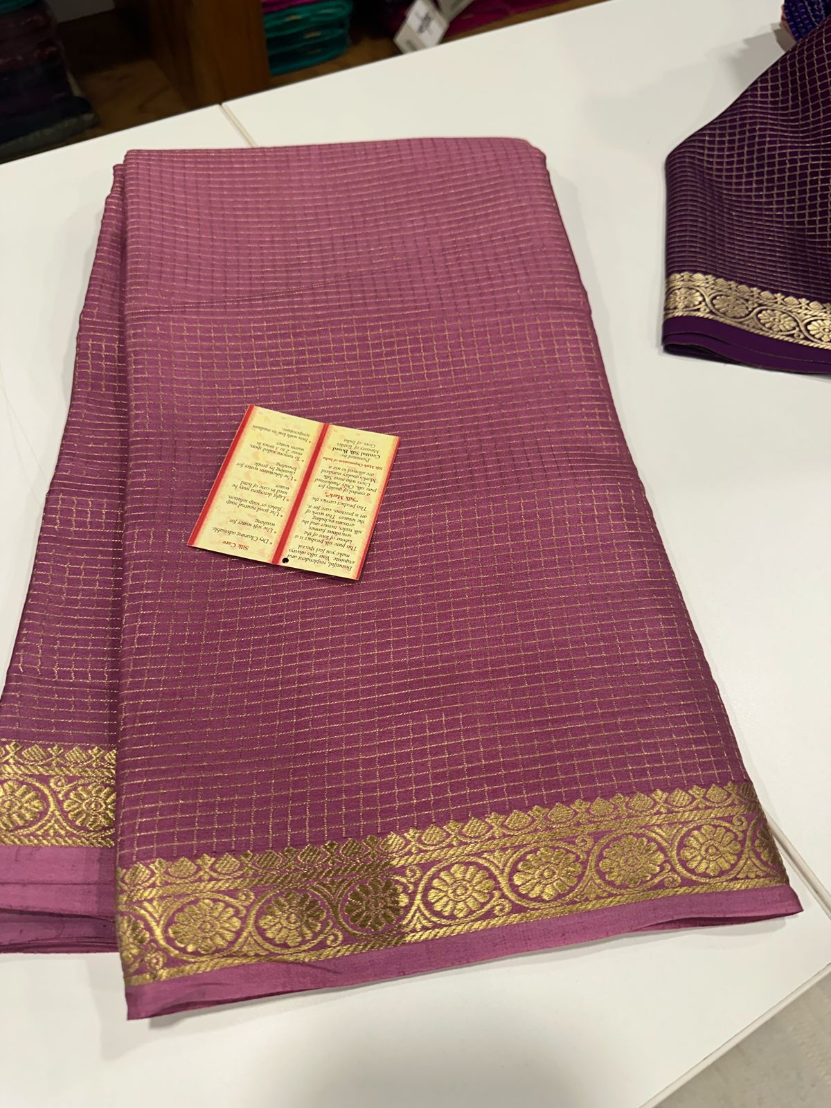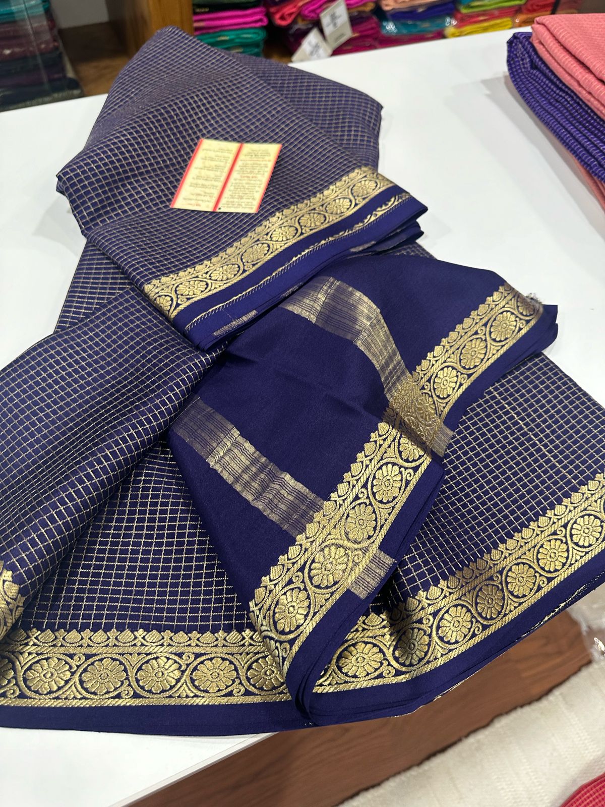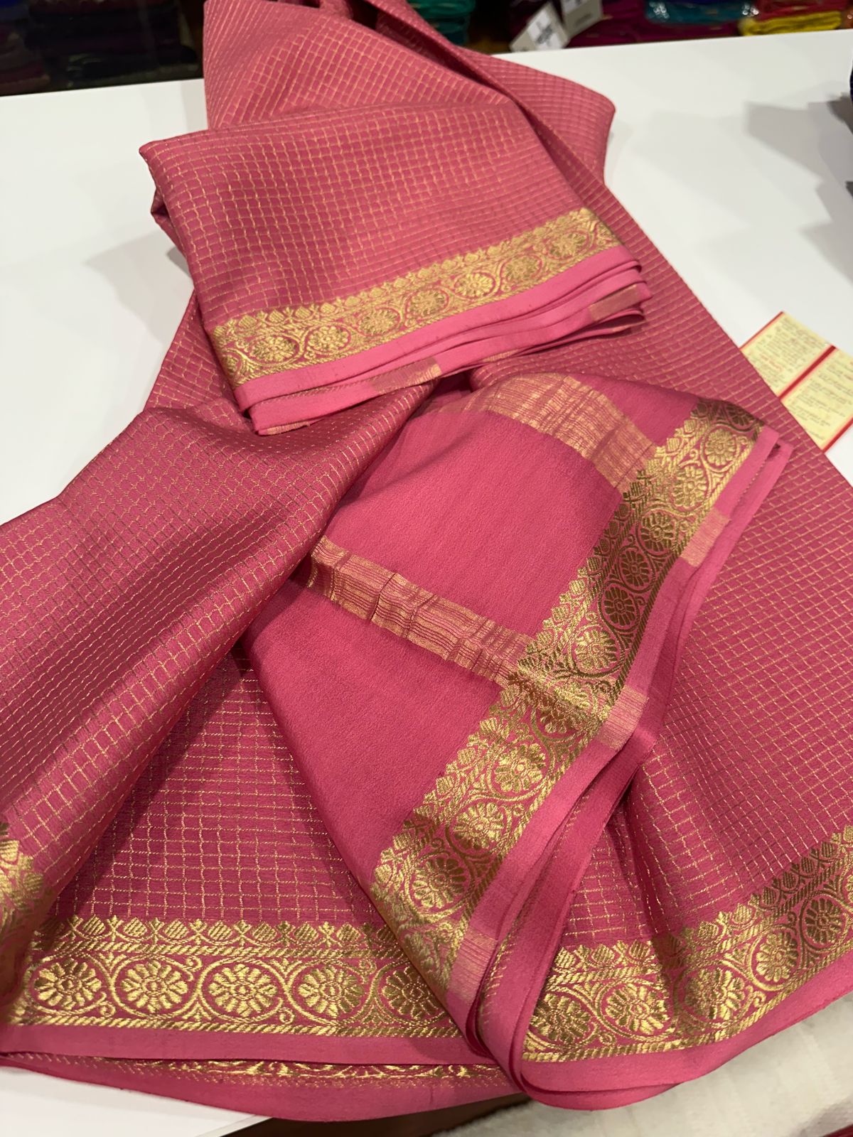 Experience sophistication with our Pure Mysore Silk Sarees adorned with delicate checks, now offered exclusively at Fashion Vibes. Crafted with fine-quality materials. Our latest designer collection features a range of captivating Pure Mysore Silk Sarees with Small Checks, ideal for adding a classic touch to any occasion.
