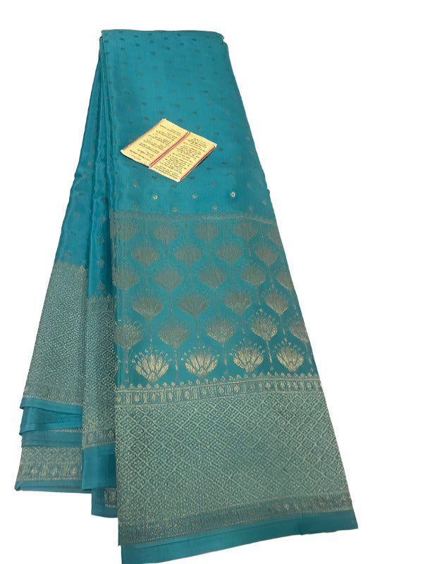 Wear this Pure Mysoore Silk saree with silver zari work and Bracode silver fabric to look stunning. This gorgeous saree is made completely of Mysoore Silk and has a 120gm traditional border.