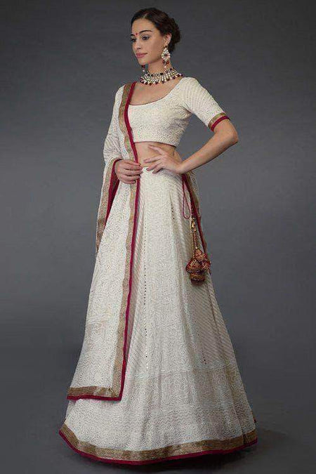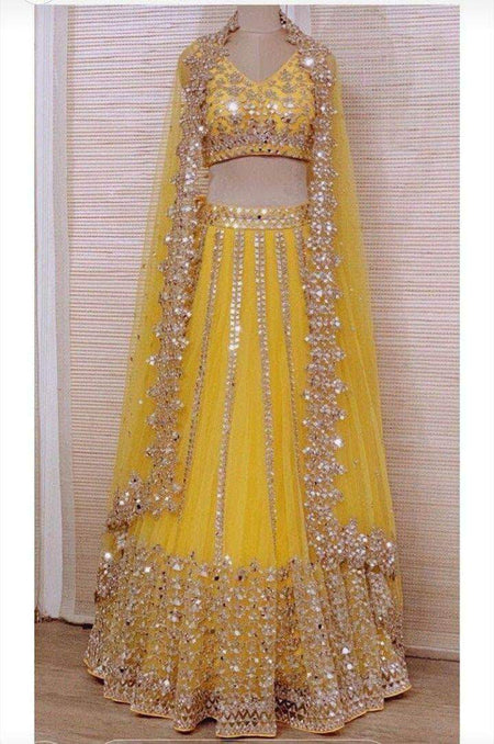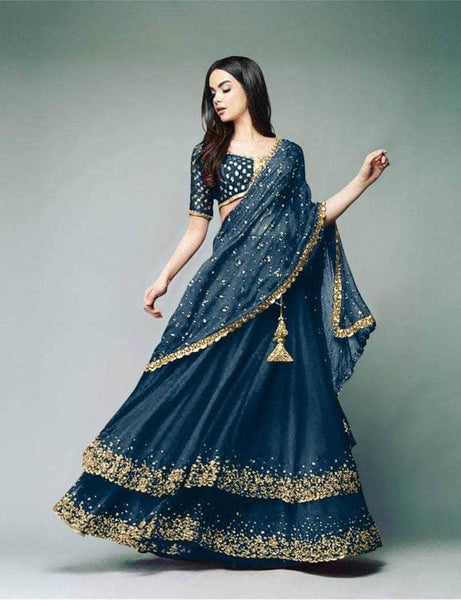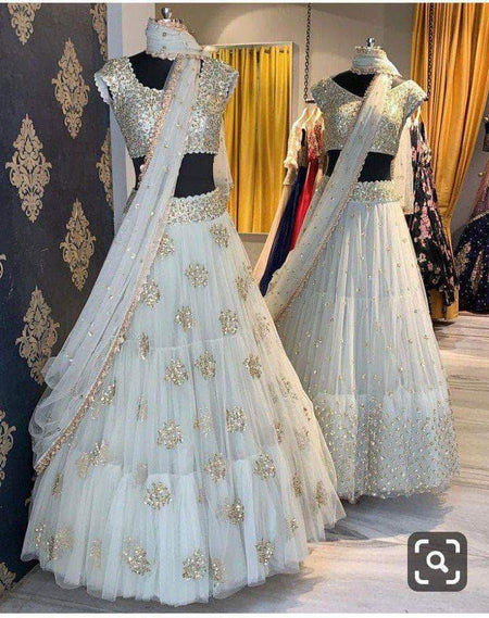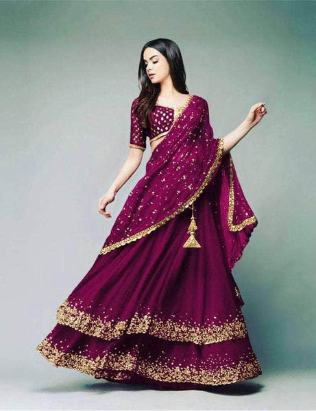 This lehenga comes with matching zari work choli and Georgette embroidered dupatta with layered sequin borders the bottom of lehenga.