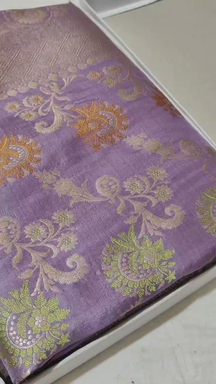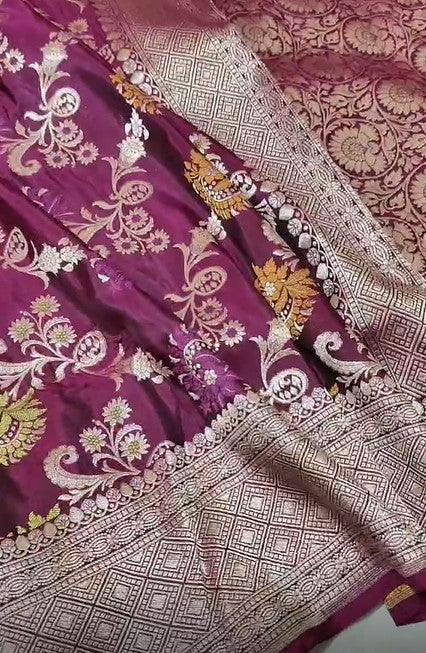 Expertly handcrafted from pure Banarasi Khaddi Katan silk, this saree boasts a luxurious sheen and intricate Allover Jaal Flowers Buta Flowers Booti Design Weaving Beautiful Border design.