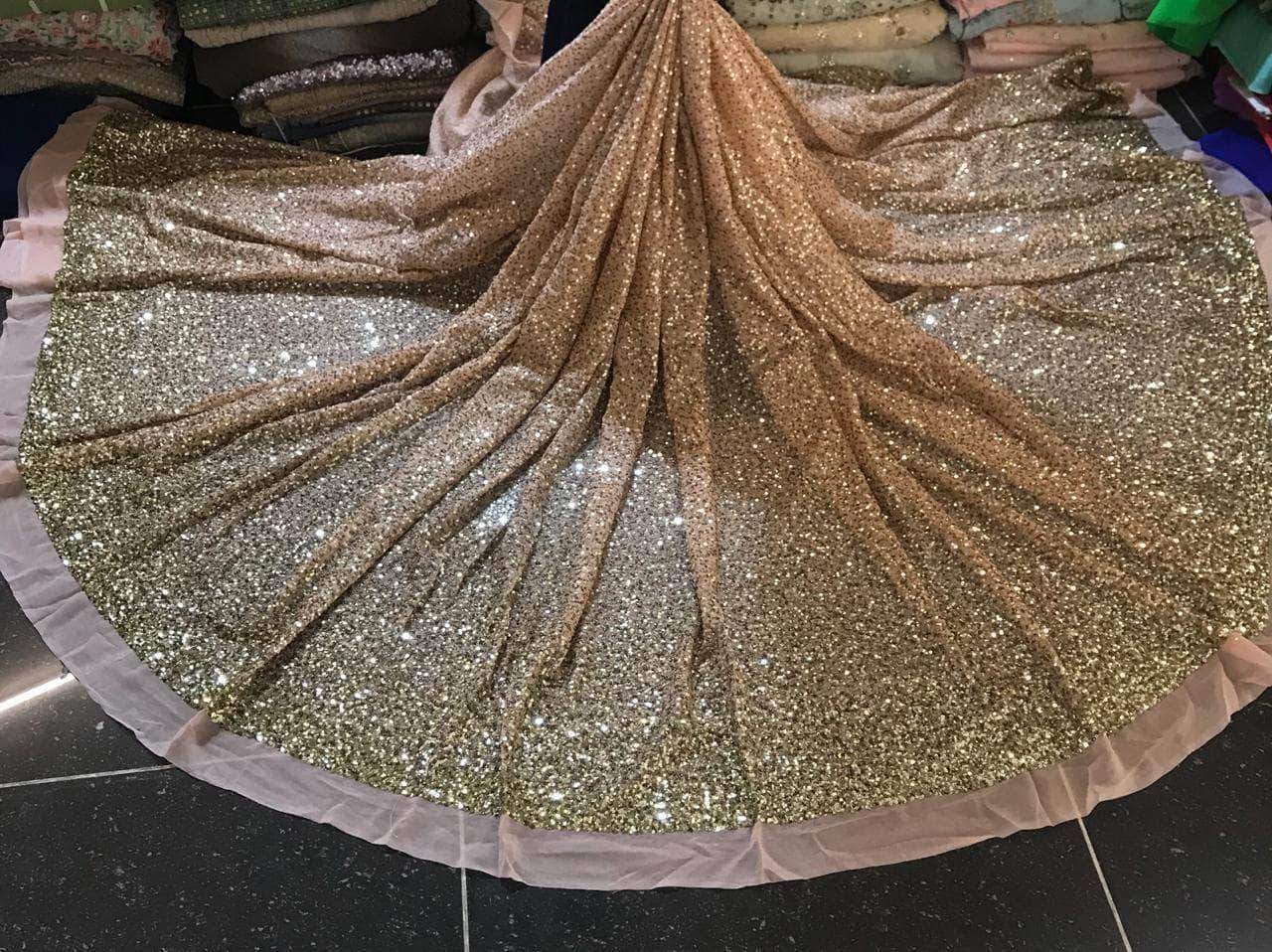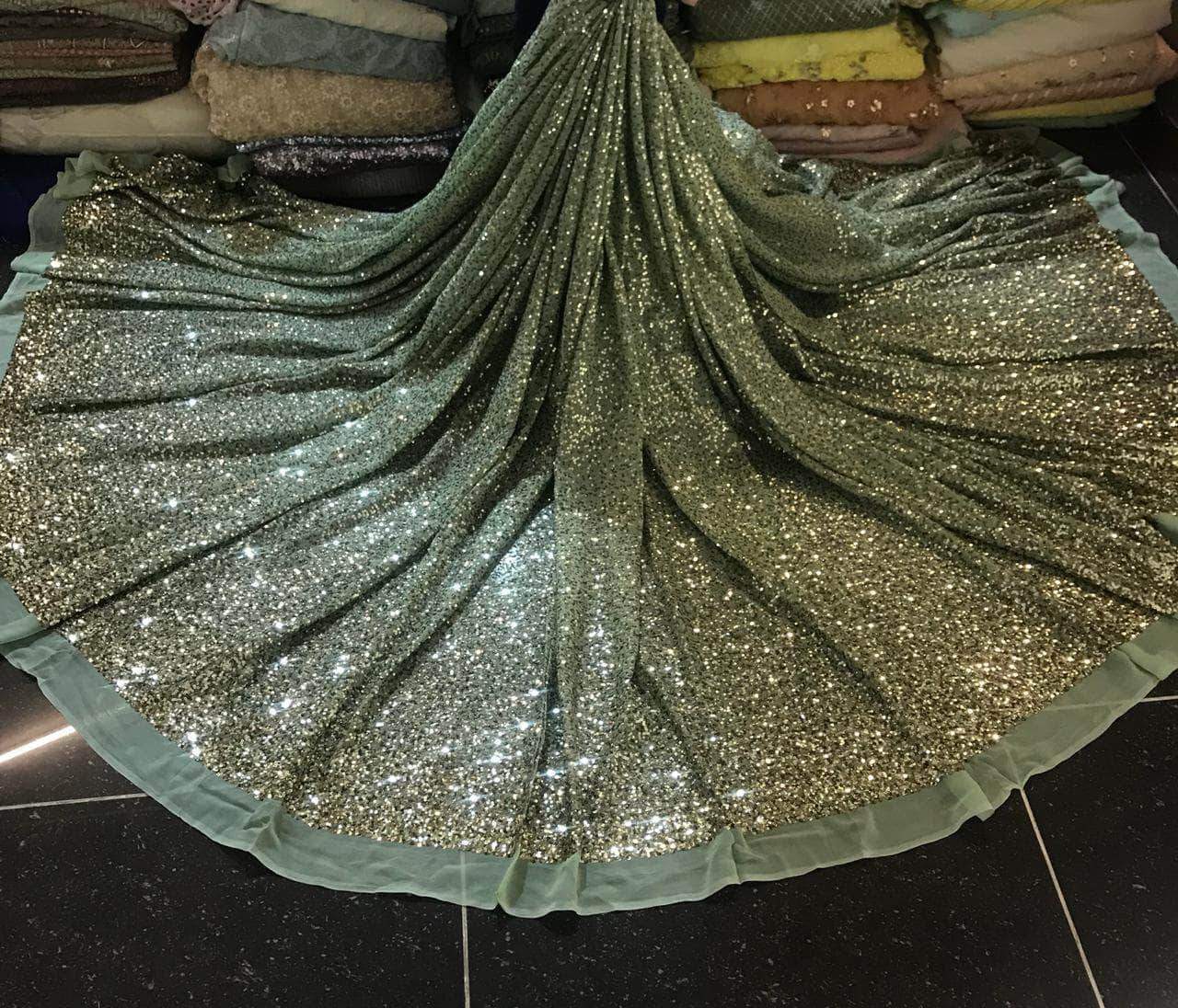 Note that this is a custom Lehenga and the fabric used will be dependent on the sequin fabric that is available at the time of the ordering . The fabric choice pics will be provided to the customer after the order is placed .