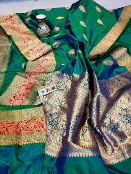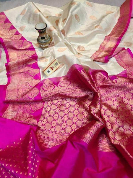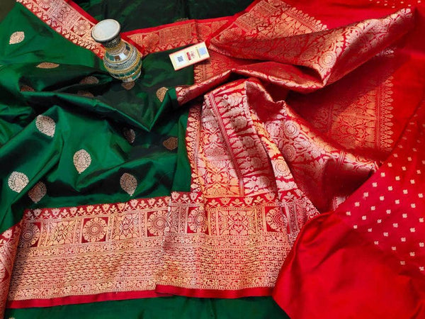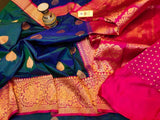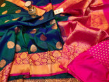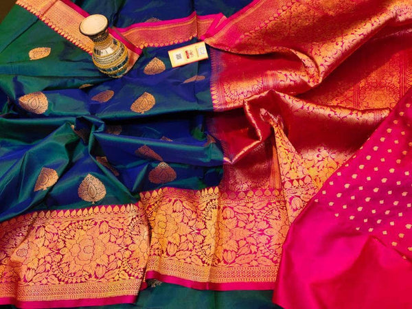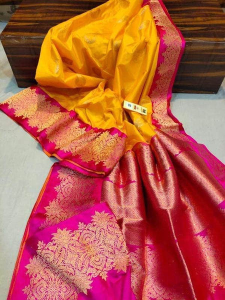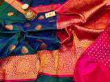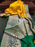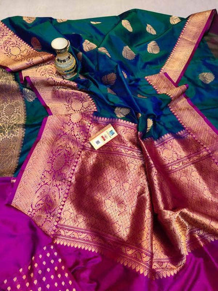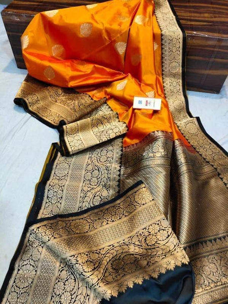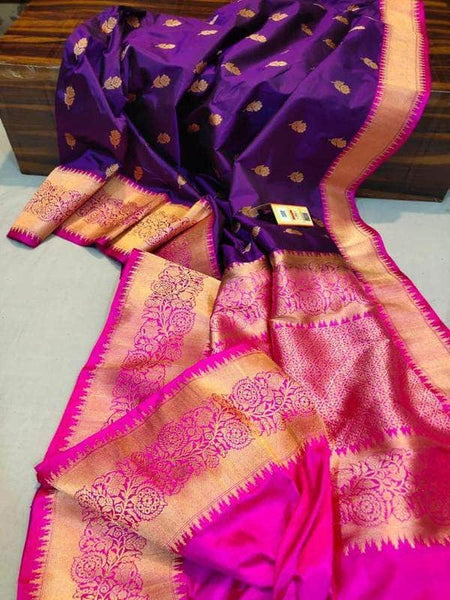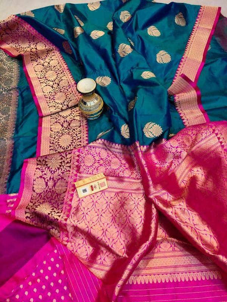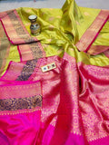 Katan Silk saree exclusive deshing and perfect shine make it a complete festive wedding or any occasion to wear this saree it comes with an Unstiched contrast blouse piece Contrasting embellished Pallu and border completes the look.