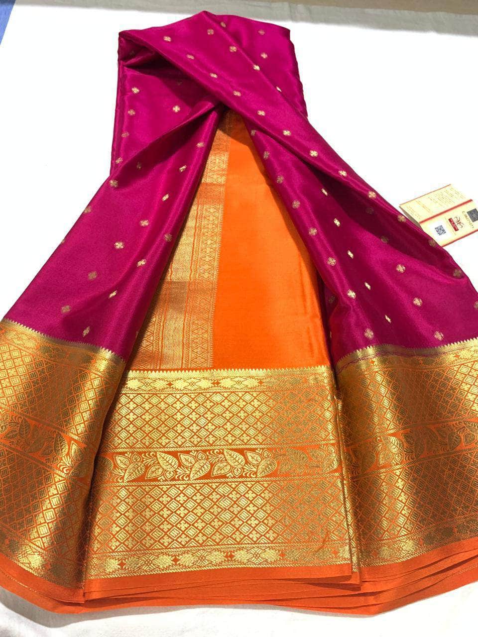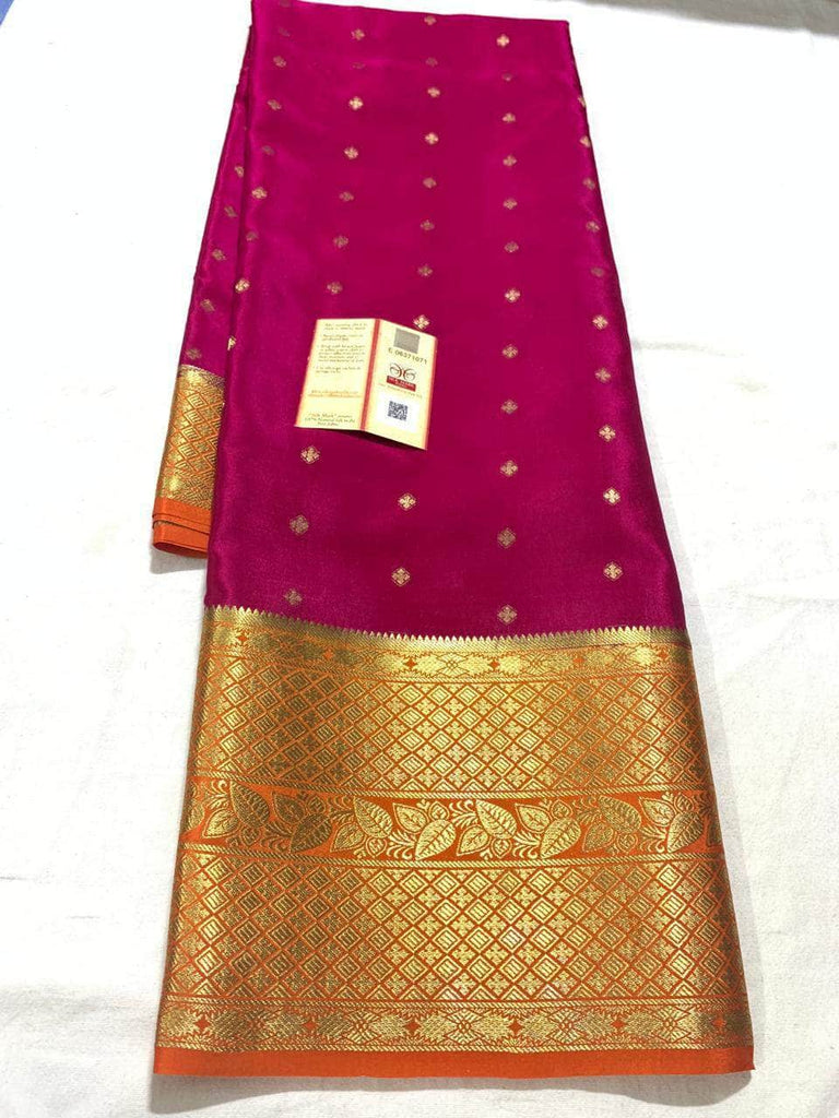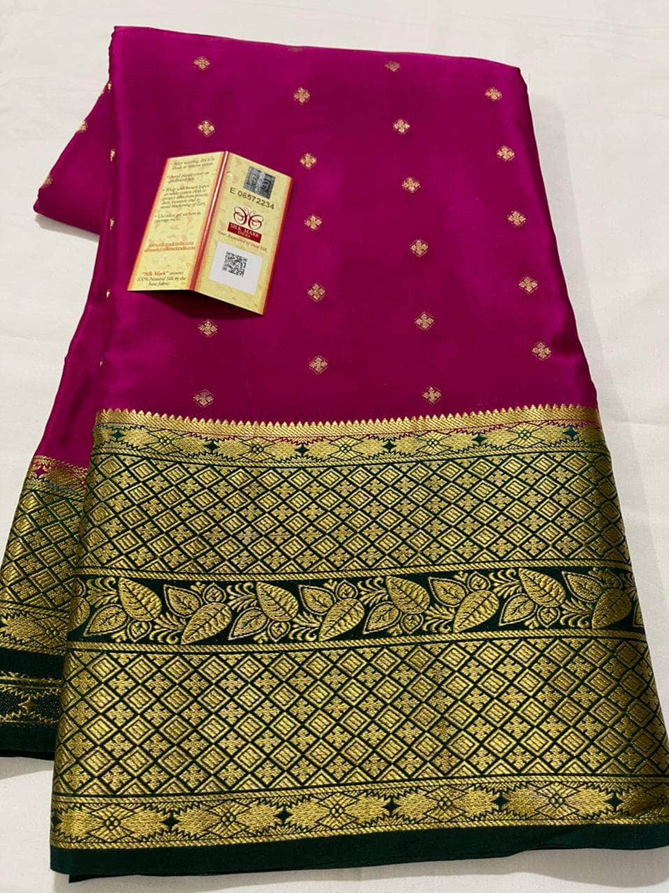 Fashion Vibes presents Pure South Silk Sarees with Rich Pallu 120 gram thickness. Long border with Motifs all over saree which comes with rich pallu and contrast border blouse has a long border.